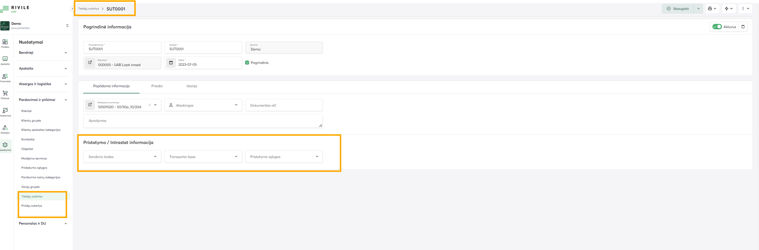 - “Nustatymai” → "Pardavimai ir Pirkimai" → "Tiekėjų sutartys / Pirkėjų sutartys" užpildykite pristatymo informaciją.