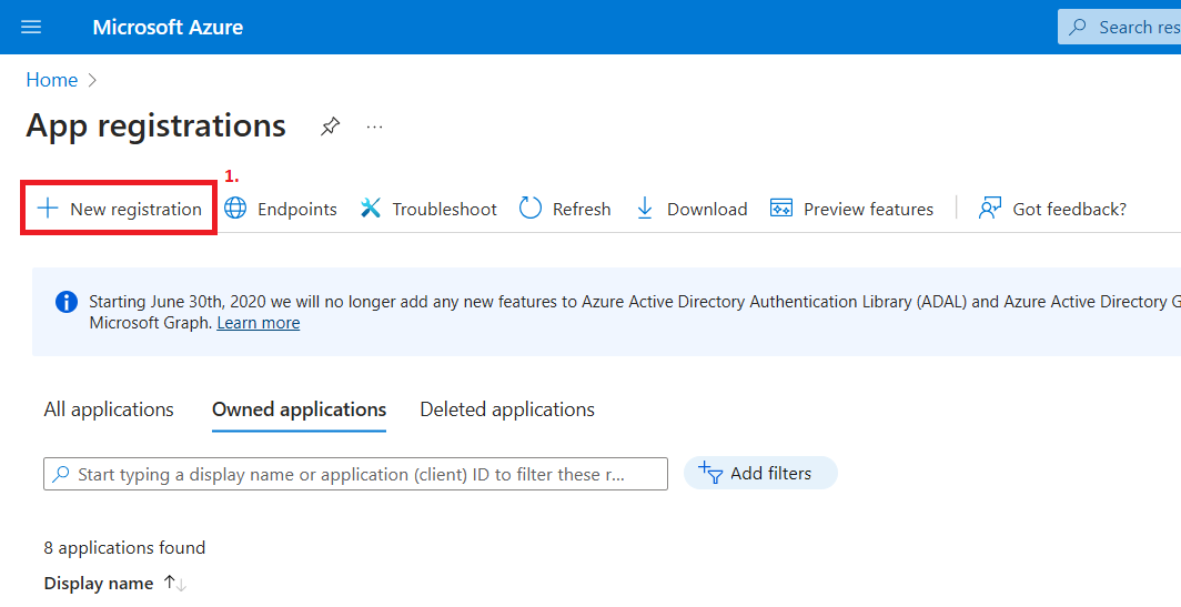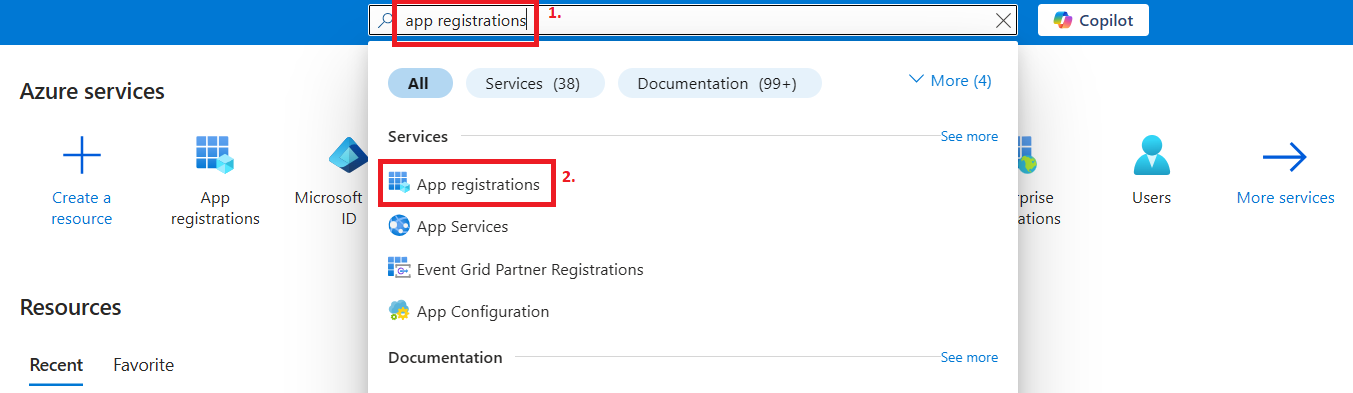Prisijunkite prie savo Azure portalo. Portalo paieškos langelyje įrašykite App registrations ir pasirinkite šį meniu punktą iš paieškos rezultatų.
