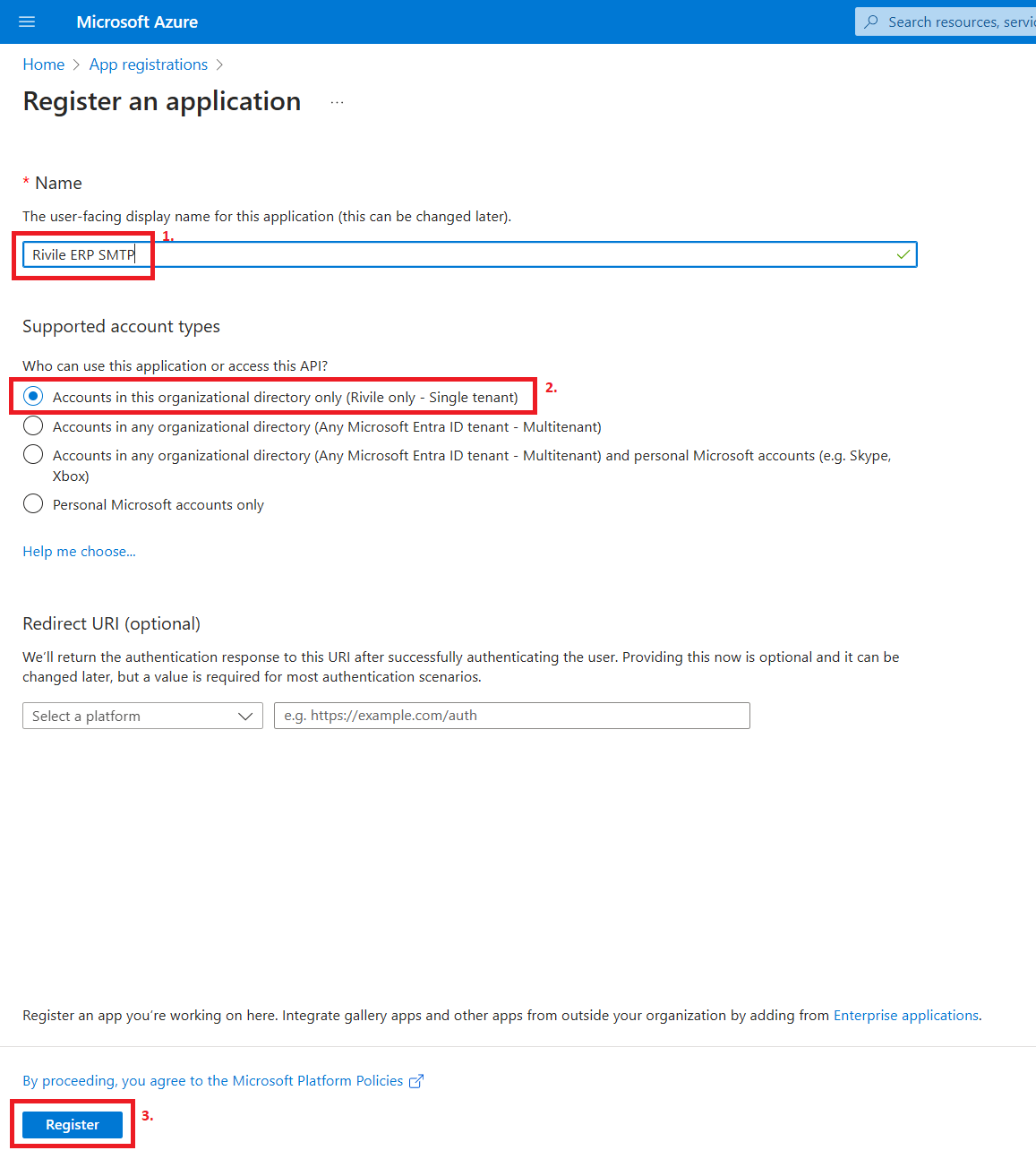 Šiek tiek žemiau būtinai pasirinkite Accounts in this organizational directory only (Single tenant). Paspauskite mygtuką Register.