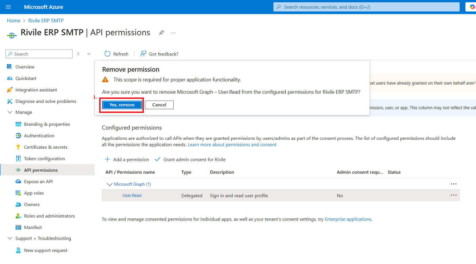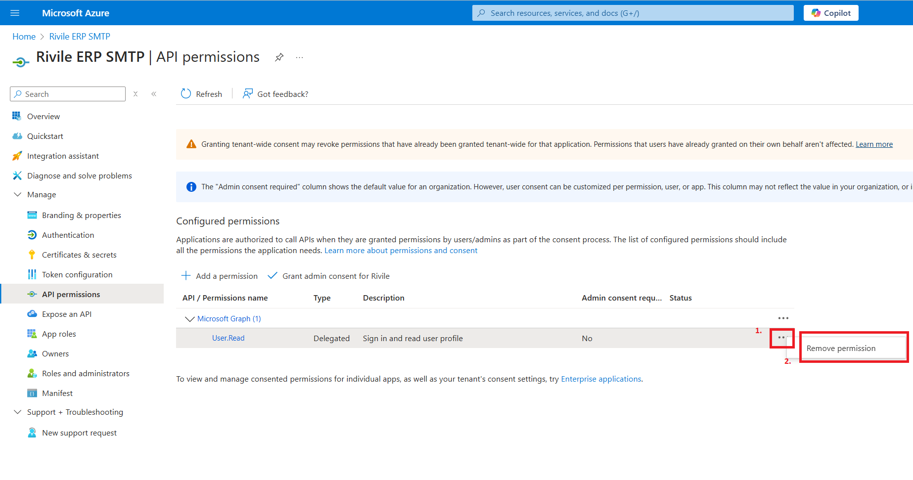 Atsidariusiame lange prie User.Read leidimo išskleiskite meniu ir pasirinkite Remove permission. Šis leidimas nėra reikalingas Rivile ERP veikimui.