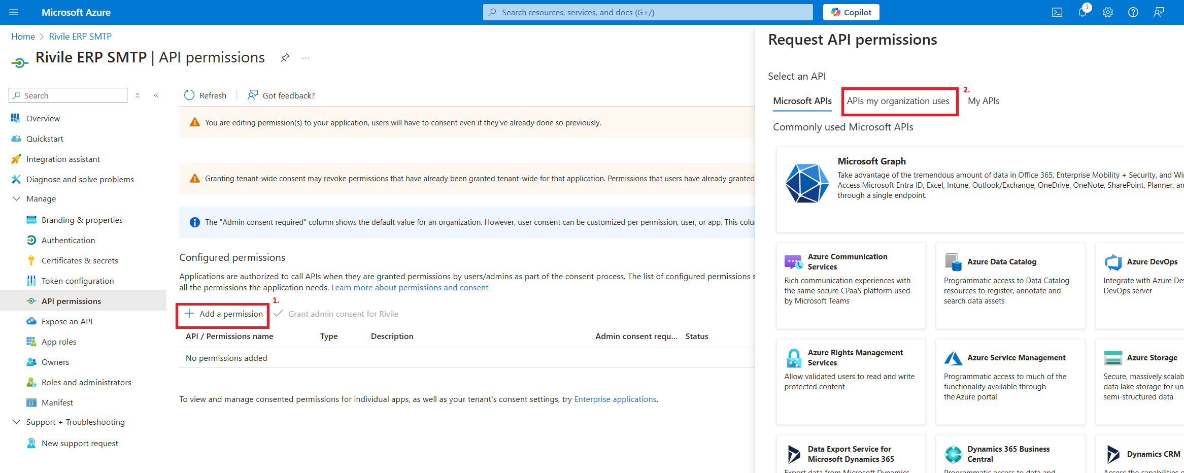 Dabar galite pridėti reikiamus leidimus. Paspauskite ant nuorodos Add a permission. Iššokusiame lange pasirinkite APIs my organization uses kortelę.