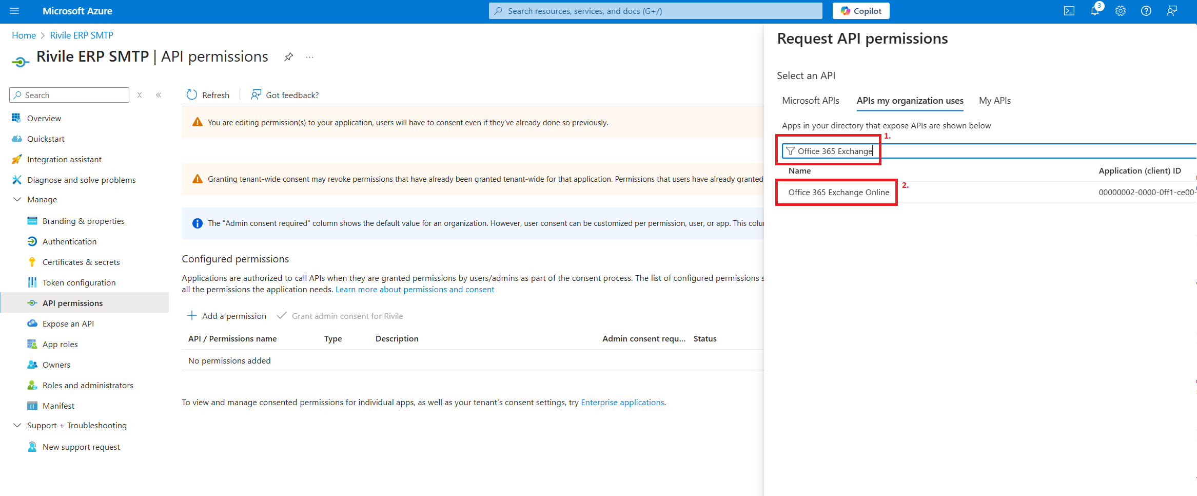 Laiškų siuntimui per Microsoft 365 paslaugą Rivile ERP naudoja Exchange Online SMTP serverį. SMTP autentikacija vyksta aplikacijos, o ne konkretaus vartotojo vardu (angl. client credentials flow). Tai reiškia, kad prieš siunčiant laiškus, turite sukonfigūruoti savo Microsoft 365 organizacijos paskyrą, suteikti reikiamus leidimus į Exchange Online API. Šių leidimų suteikimui reikia sistemos administratoriaus teisių jūsų Microsoft 365 paskyroje.