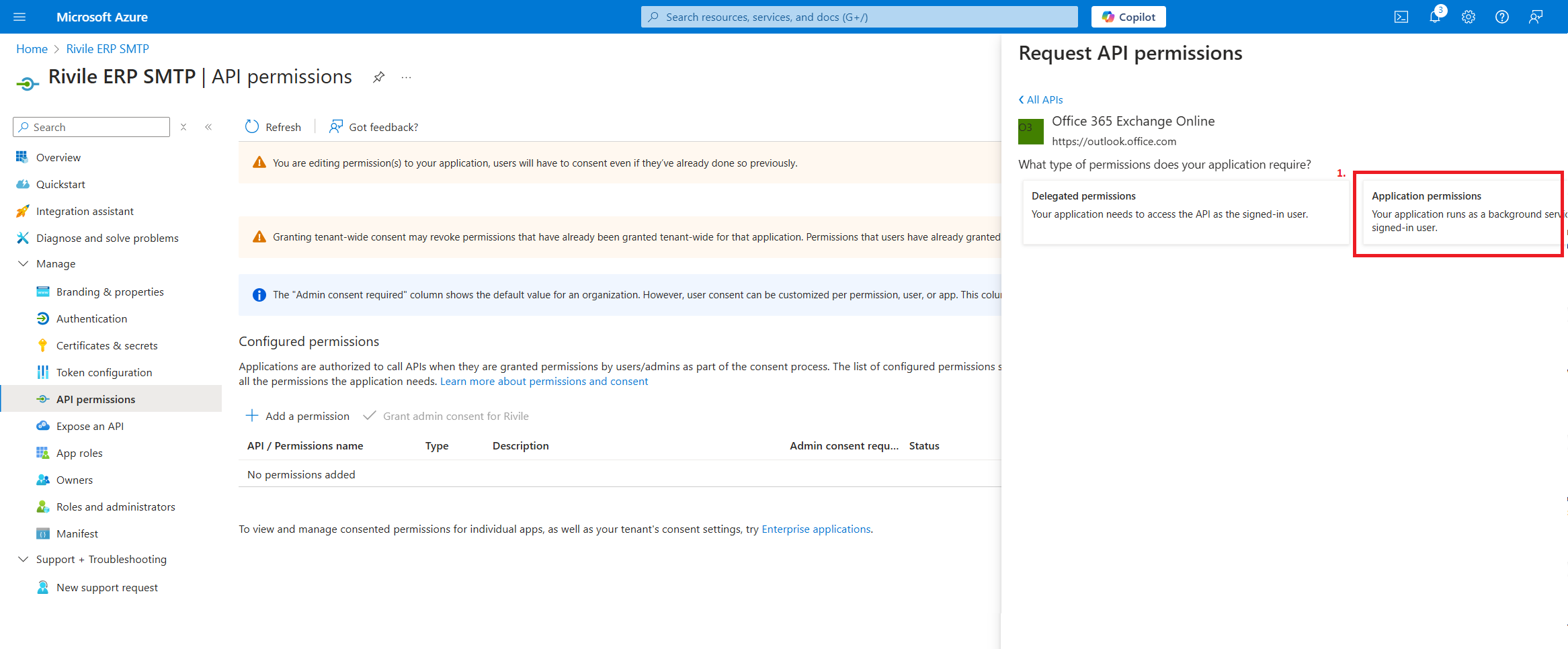 Pasirinkite skiltį Application permissions.