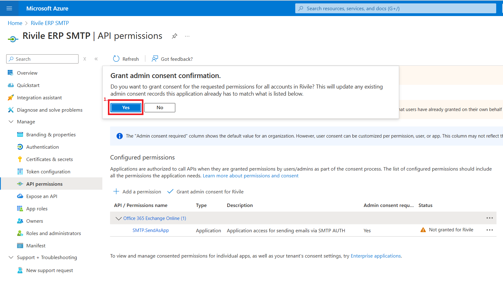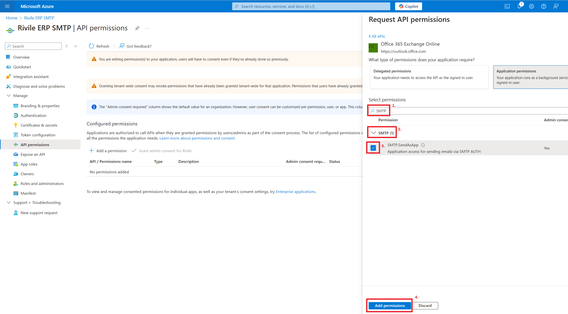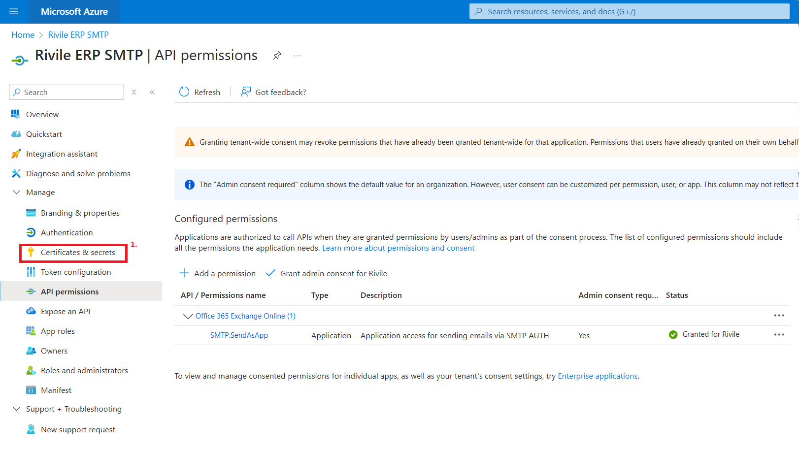 Atlikus aukščiau nurodytus veiksmus, su sugeneruotu slaptu raktu, Rivile ERP turės teises siųsti laiškus visų jūsų Microsoft 365 organizacijoje esančių pašto dėžučių vardu. Rekomenduojame sukurtai aplikacijai apriboti leidimus siųsti tik konkrečių pašto dėžučių vardu. Daugiau informacijos apie tai galite rasti Microsoft 365 dokumentacijoje.