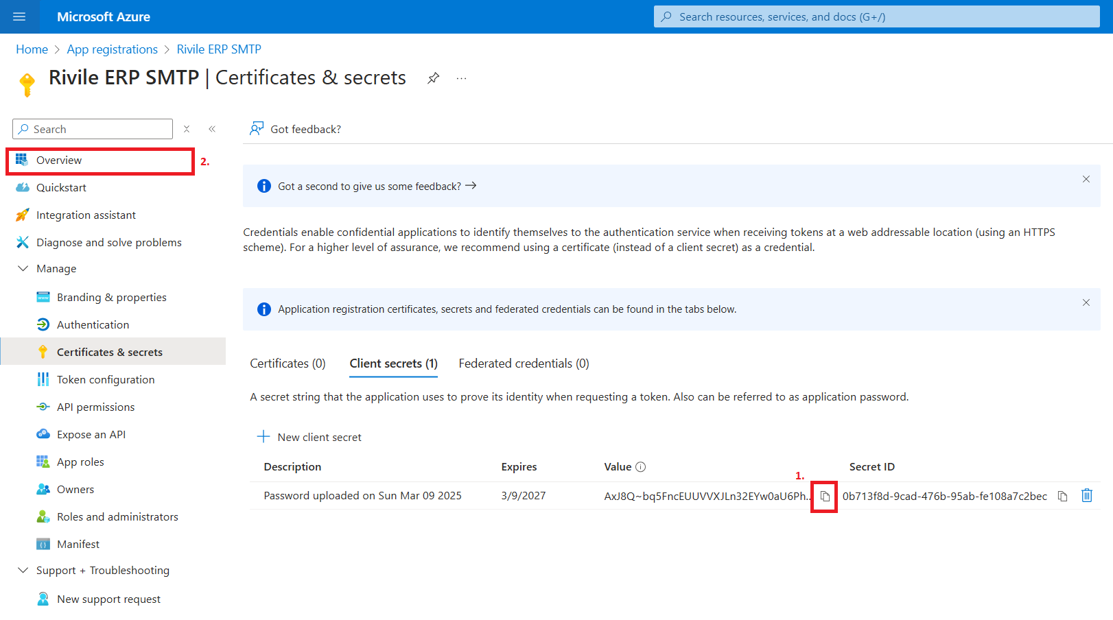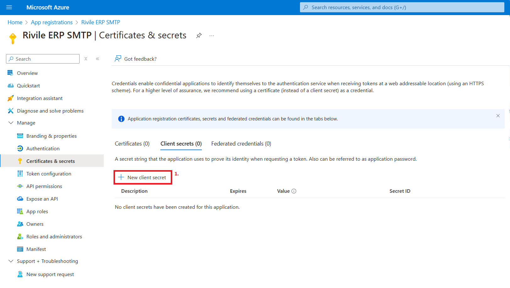 Iš meniu kairėje pasirinkite Certificates & secrets.