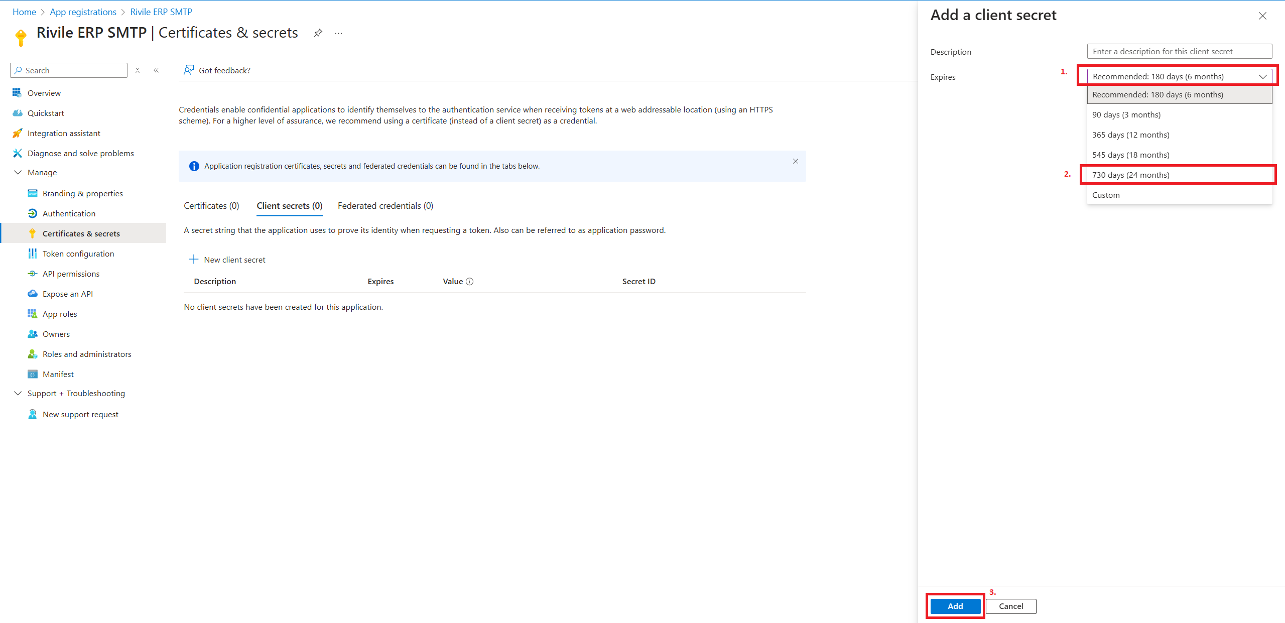 Iššokusiame lange pasirinkite, kiek laiko galios slaptas raktas ir paspauskite mygtuką Add. Pasibaigus rakto galiojimui laiškų siuntimas iš Rivile ERP per jūsų Microsft 365 paskyrą nebeveik, todėl šį žingsnį reikės pakartoti, o naują slaptą raktą įvesti Rivile ERP parametre.