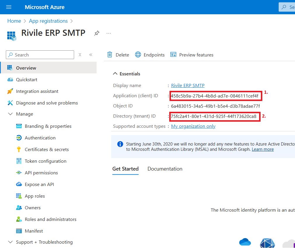 Atsidariusiame lange nusikopijuokite laukų Application (client) ID ir Directory (tenant) ID reikšmes. Jų reikės tolesniam Rivile ERP konfigūravimui.